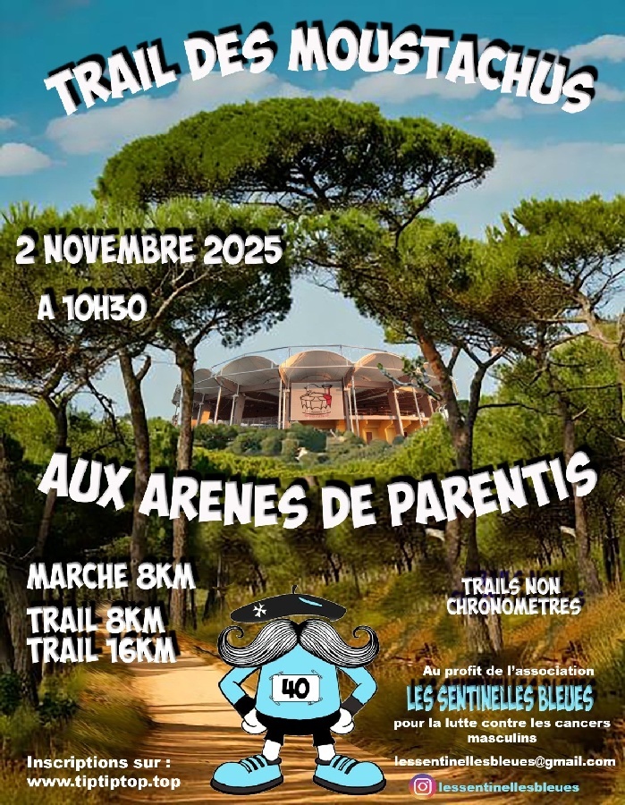 En dehors des murs de BERGONIE , vous pouvez participer au TRAIL des moustachus ou à la marche de 8 kms qui auront lieu le 02 novembre 2025 aux ARENES DE PARENTIS.